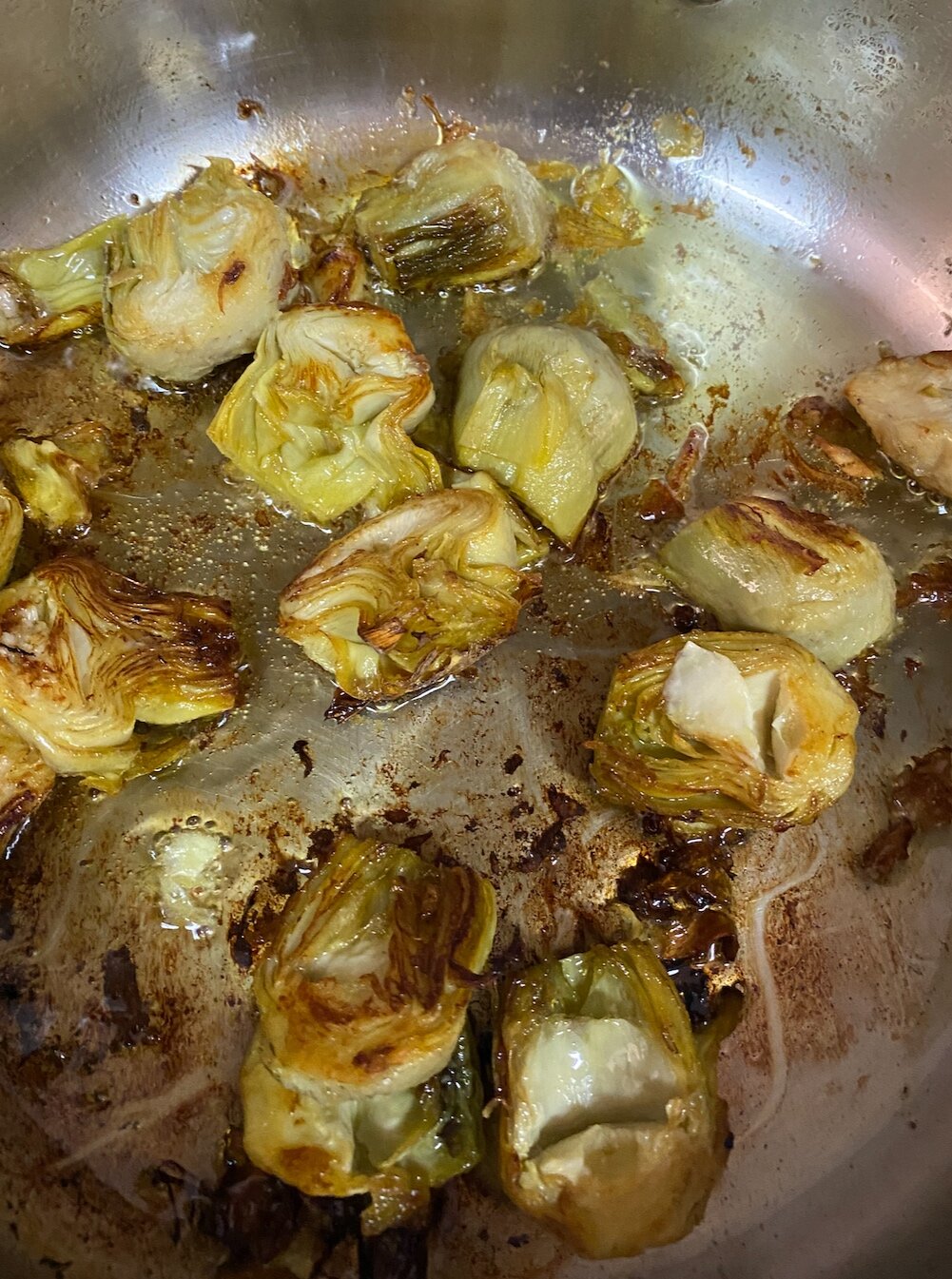 2. Vierte el aceite de oliva en un sartén mediano y cuando este bien caliente pon los corazones de alcachofa partidos a la mitad. Cuando estén dorados los sacas (deja el aceite en el sartén) y ponlos en un recipiente aparte.